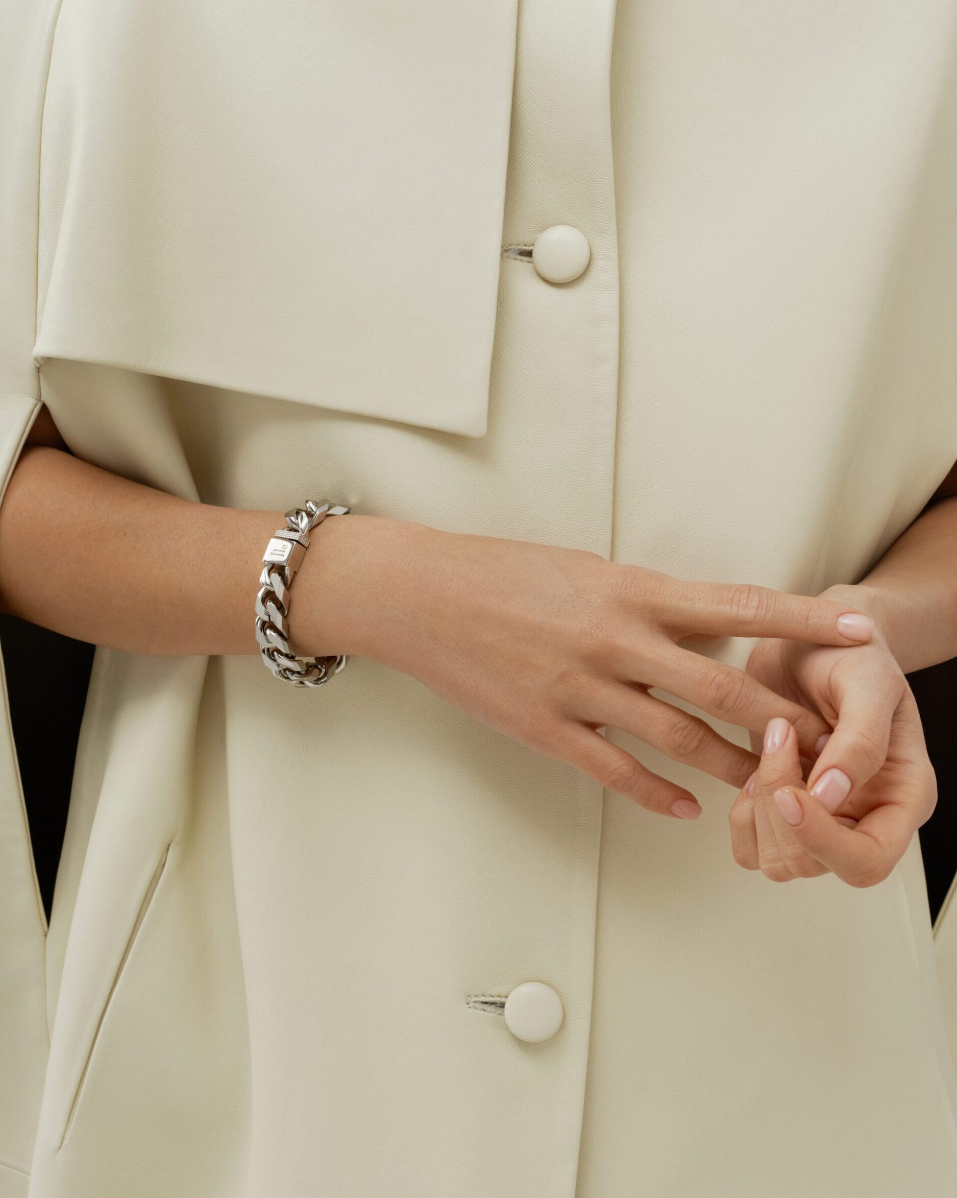 Браслет у золотому кольорі — як штрих завершення. Великі ланки м’яко віддзеркалюють світло, підкреслюючи рельєф зап’ястя та гру тіней на шкірі. У цьому виробі —…