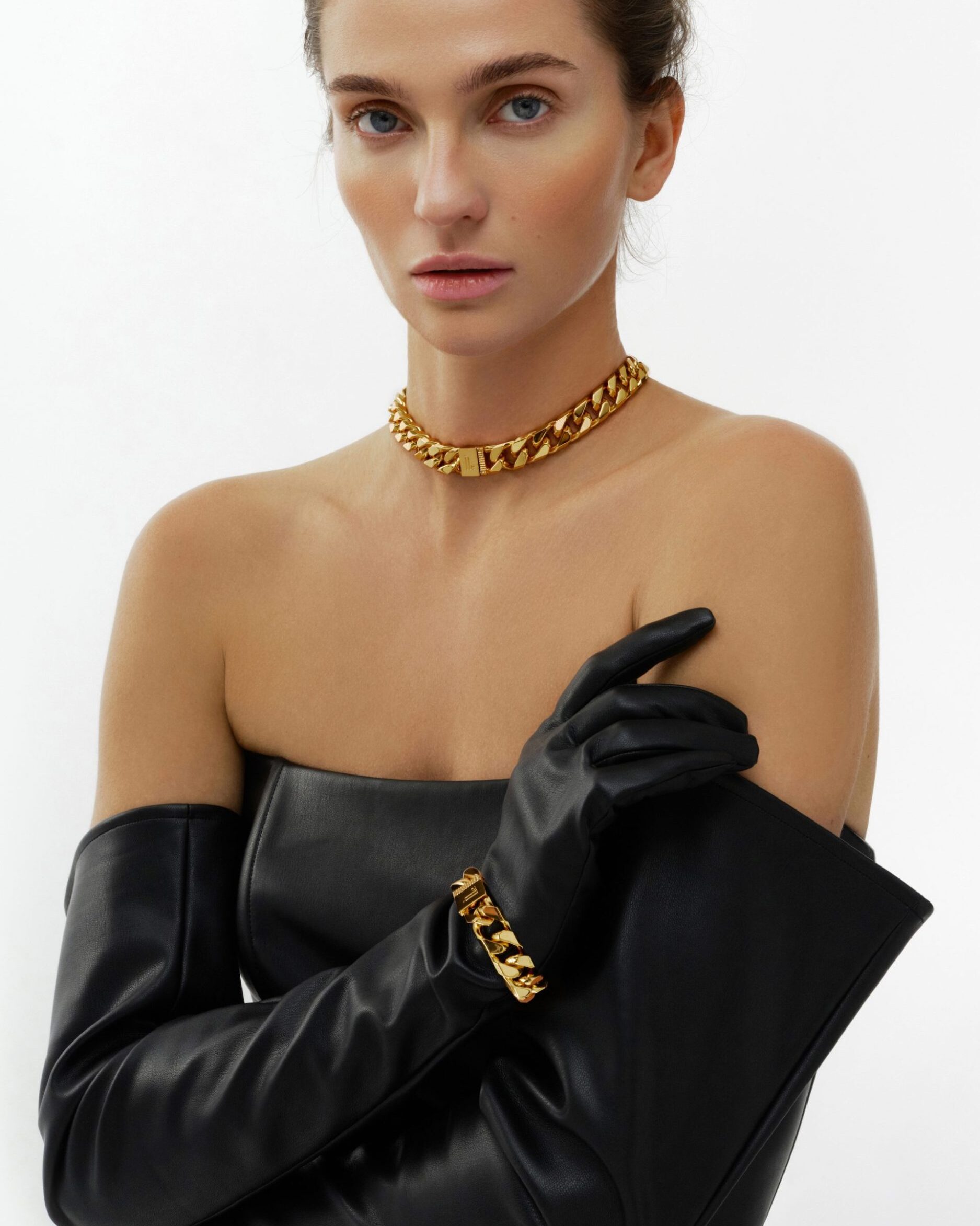 Завдяки своїй геометричній формі браслет у золоті впевнено лежить на зап’ясті, стаючи природним продовженням образу. Його дизайн — це діалог між строгістю ліній і тілесною…
