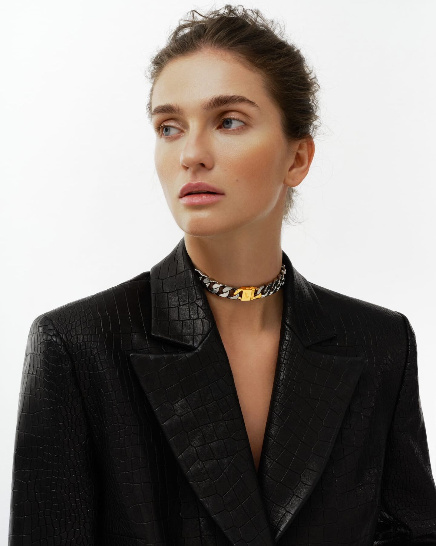 Чокер з карабіном у золоті — про силу контрасту. Щільне плетіння у металі лягає до шиї з точністю, що підкреслює лінію силуету. Центральний акцент — золотий карабін, що читається як замикання історії, де кожна деталь — продумана. Це не просто застібка, а символ контролю, незалежності й енергії.